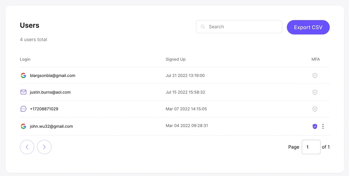 Data for which users are using your application can be found in the Users tab in your Magic Dashboard. Basic attributes are provided per user, including their email address, when they signed up and when they last logged in. Customers who are Startup and Growth subscribers will also have the ability to export data into a CSV format. This is available via theExport CSV button in the top right hand corner of the page.
