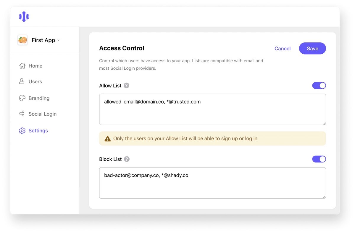 The Access Control feature allows you to easily manage who is and isn’t allowed to log in to your application. Access can be gated in 2 ways: explicitly allowing only certain emails and domains through with Allow List, or blocking certain emails and domains with Block List.