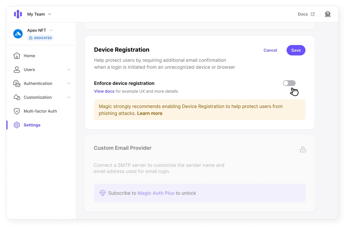 While we highly recommend enforcing device registration, this feature can be disabled on a per-app basis. To disable device registration, head to the Settings page in Magic’s developer dashboard.