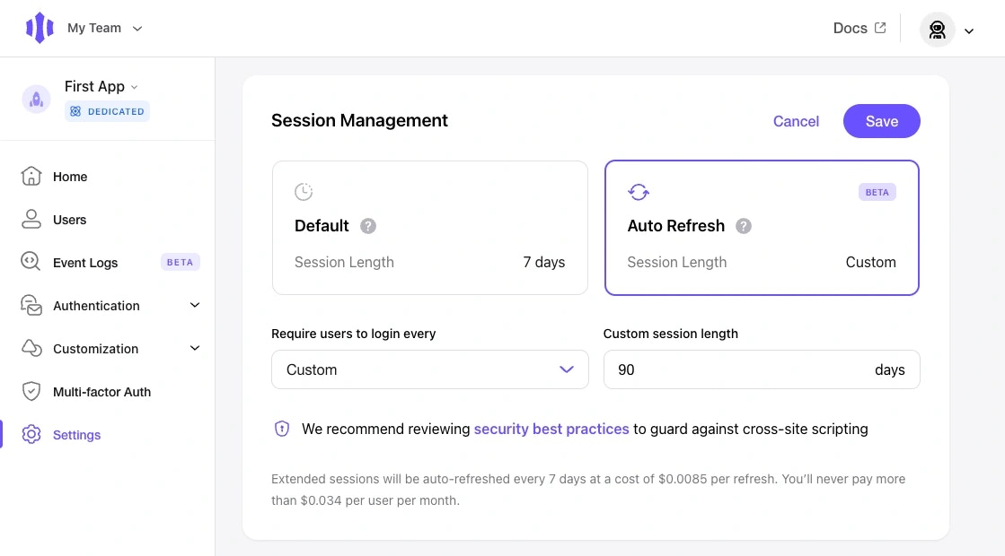 The Session Management feature allows you to control the maximum duration of your user’s sessions with Magic. Default sessions will allow users to remain authenticated with Magic for up to 7 days (or until they logout or browser data is cleared). Auto Refresh sessions will allow users to stay authenticated with Magic for a duration of your choosing, up to 90 days (or until they logout or browser data is cleared). When Auto Refresh is enabled, each successful authentication will be issued a refresh token along with the session token. The refresh token will be valid for the configured number of days and while valid, will allow the user to bypass re-authentication. Once the refresh token expires, the user will need to re-authenticate with Magic.