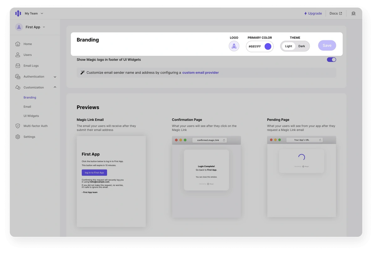 You can customize the logo and colors of the Magic email, confirmation screen, and pending modal on the Branding tab in the Magic Dashboard: